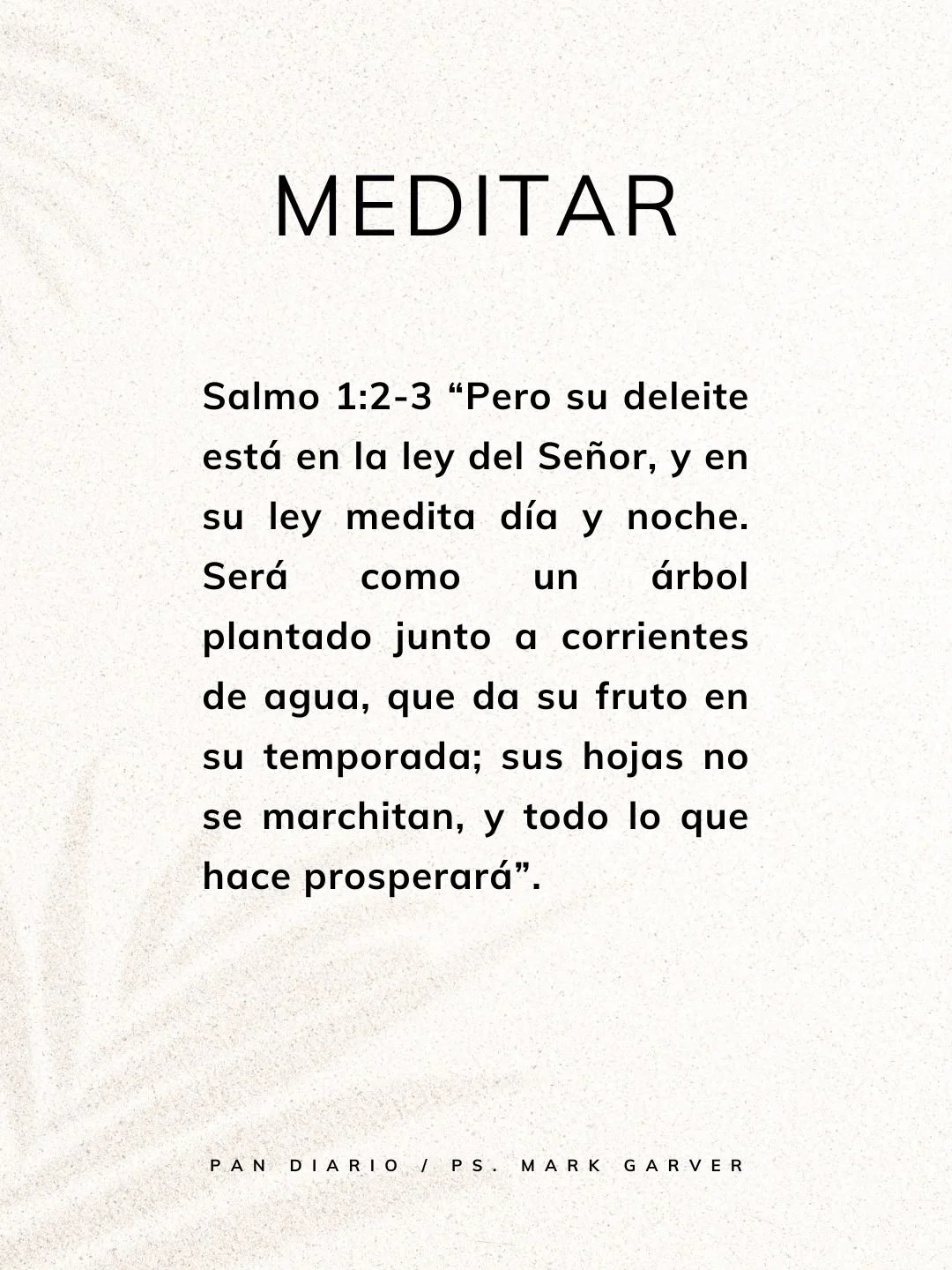 Salmo 1:2-3 “Pero su deleite está en la ley del Señor, y en su ley medita día y noche. Será como un árbol plantado junto a corrientes de agua, que da su fruto en su temporada; sus hojas no se marchitan, y todo lo que hace prosperará”.